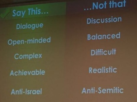 Per esempio una diapositiva ,presentata alla conferenza , invita a chiamare gli attivisti "anti-Israeliani ", piuttosto che "anti-semita".La raccomandazione è non bollare tutti i sostenitori dei diritti dei palestinesi come antisemita