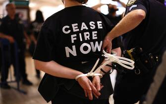 “NON NEL NOSTRO NOME”Le foto scattate mostrano lunghe file di giovani ammanettati con indosso felpe nere con le frasi "Non nel nostro nome" e "Cessate il fuoco adesso" stampate in bianco. Il massiccio sit-in è stato organizzato dal gruppo Jewish Voice for Peace-New York City, che ha bloccato l'ingresso principale del terminal: è stato - hanno detto gli organizzatori - "il più grande atto di disobbedienza civile che New York City abbia visto negli ultimi vent'anni"